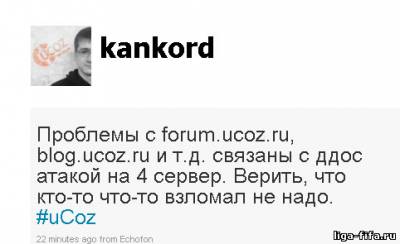 Хм.. как не странно но начали взлом с сайта uBlogs.net, то есть в скрипт вставили редирект на сайт с информацией о взломе. На данный момент взломан Официальный форум uCoz Почти все пользователи которые были зарегистрированы на форуме, удалены. Бекап думаю есть:) Вот так сейчас выглядит главная Юблогов Так же не работает Официальный блог uCoz. Сейчас увидел в твиттере одного из координаторов uCoz`a текст: Мне собственно мало вериться. Что будет дальше? Посмотрим... По моему это предупредительный выстрел, перед выстрелом в голову,будем ждать... Рейтинг: 5.0/2 Читать новость про "U[coz]PYACHKA - Взлом системы uCoz."Теги: